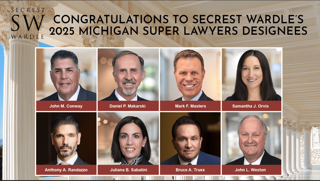 Secrest Wardle is pleased to announce that eight Secrest Wardle attorneys have been named to 2025 Michigan Super Lawyers. Super Lawyers is a rating service of outstanding lawyers who have attained a high degree of peer recognition and professional achievement. The selection process includes independent research, peer nominations and evaluations. No more than five percent of each state’s attorneys are recognized on the Super Lawyers list.