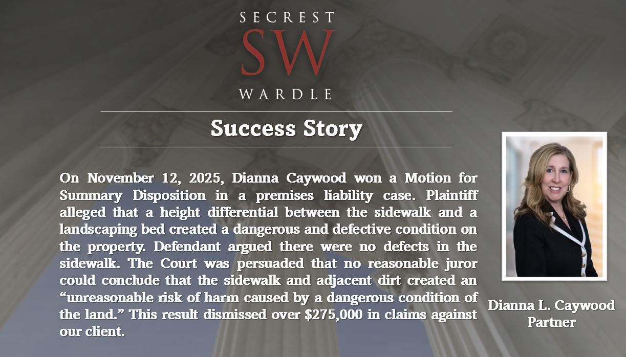 By svertel@secrestwardle.com | February 17, 2026 | Comments Off on Dianna Caywood Wins Premises Liability Case; Court Finds No Dangerous Condition in Sidewalk Case